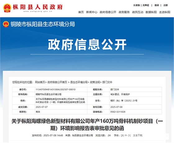 7月8日,安徽铜陵市枞阳县生态环境局发布“关于枞阳海螺绿色新型材料有限公司年产160万吨骨料机制砂项目(一期)环境影响报告表审批意见的函”。