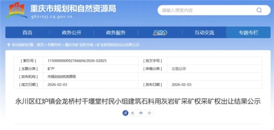 2026年2月3日,重庆市永川区规划和自然资源局公示永川区红炉镇会龙桥村干堰堂村民小组建筑石料用灰岩矿采矿权出让结果。
