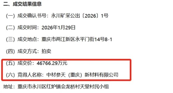 该矿资源储量6167万吨,出让年限22.6年,出让收益起始价23866.29万元,中材参天(重庆)新材料有限公司以46766.29万元拍卖竞得,溢价率接近96%。