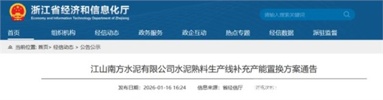 近日,浙江经信厅发布“江山南方水泥有限公司水泥熟料生产线补充产能置换方案通告”。