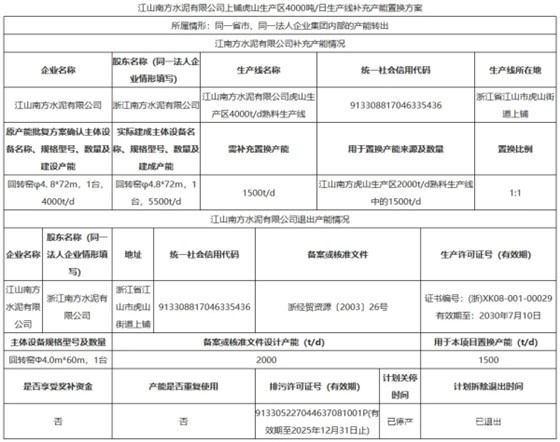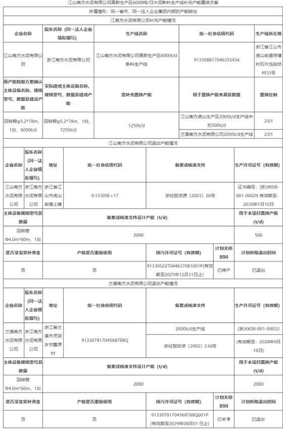 江山南方水泥高新生产区一条6000t/d熟料生产线补充产能1250t/d,退出产能来自江山南方虎山生产区一条2000t/d生产线(500t/d用于本项目),兰溪南方水泥一条2000t/d生产线,置换比例2:1。