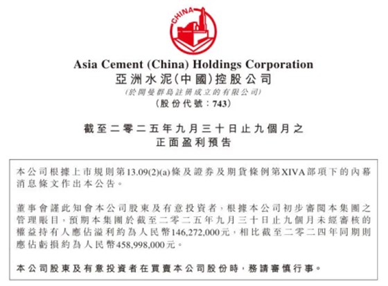 近日,亚洲水泥(中国)发布正面盈利预告。