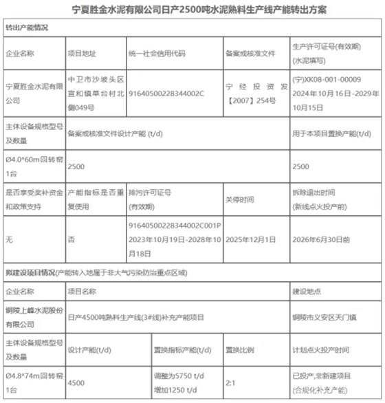 置换方案显示,宁夏胜金水泥退出一条2500t/d熟料生产线,用于铜陵上峰水泥4500t/d生产线补充产能,补充后产能5750t/d,置换比例2:1。