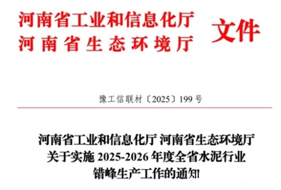 10月22日,河南省工信厅发布《河南省工业和信息化厅河南省生态环境厅关于实施2025-2026年度全省水泥行业错峰生产工作的通知》。《通知》要求,全省水泥熟料生产企业都要参与错峰生产。