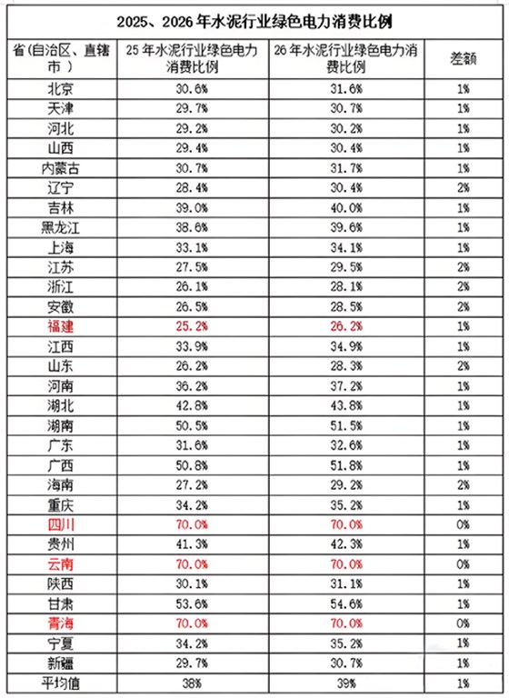 这个是继2025年3月26日水泥行业纳入全国碳排放权交易市场后,又强制绿电消费比例。具体各省2025年度和2026年度消费比例如下表: