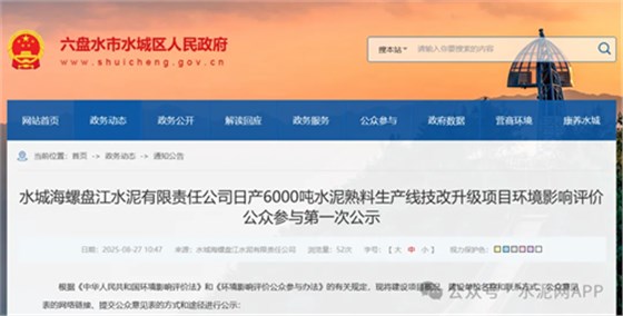 近日,贵州六盘水市水城区人民政府发布“水城海螺盘江水泥有限责任公司日产6000吨水泥熟料生产线技改升级项目环境影响评价公众参与第一次公示”。
