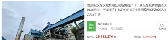 相关信息显示,贵州新双龙水泥有限公司所属资产挂牌转让,挂牌价29,122,276元。