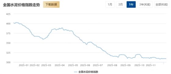 12月5日,全国水泥价格指数报收308.79点,环比下跌0.1%,同比下跌23.82%。