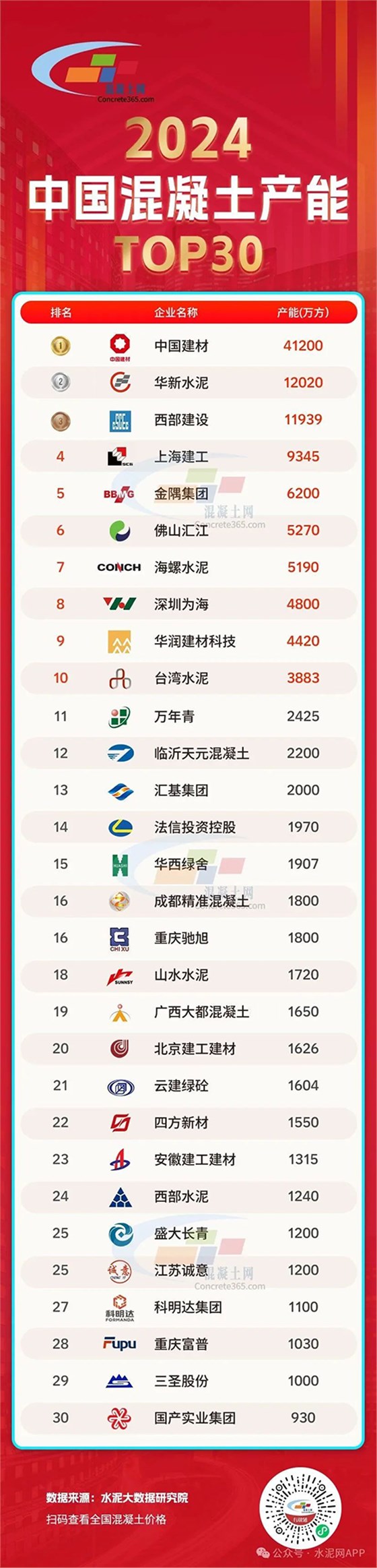 近日,中国水泥网发布2024年中国预拌混凝土TOP30产能排行榜。