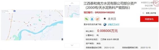 12月3日,江西泰和南方水泥有限公司转让2000t/d、500t/d水泥熟料产能指标,转让单价60元/吨,总价4500万元。