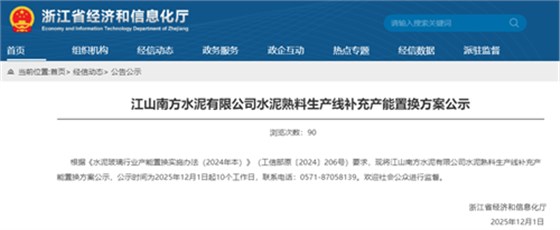 12月1日,浙江省经信厅发布“江山南方水泥有限公司水泥熟料生产线补充产能置换方案公示”。