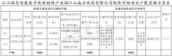 退出产能同样来自江山绿色智能数字化新材料产业园水泥优化升级项目,原产能置换方案中江山南方水泥有限公司虎山生产区2000t/d水泥熟料生产线中的500t/d变更调整用于本项目补充产能置换;及兰溪南方一条2000t/d熟料生产线,置换比例2:1。