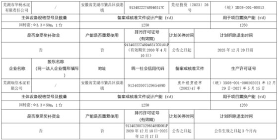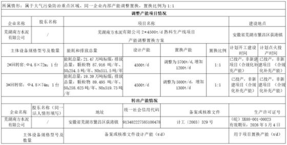 方案显示,芜湖南方水泥有限公司拟将2#、3#水泥熟料生产线(产能均为4500t/d)通过补产能方式分别增加到5700t/d、5800t/d,置换产能来自本企业1#水泥熟料生产线(产能为2500t/d),产能调整置换比例为1:1。