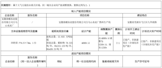 安徽海螺水泥股份有限公司白马山水泥厂拟将1条4000t/d水泥熟料生产线通过补产能方式增加到5250t/d,置换产能来自芜湖市华杨水泥有限责任公司(产能1250t/d)、芜湖瑞信水泥有限公司(1250t/d),置换比例为2:1。