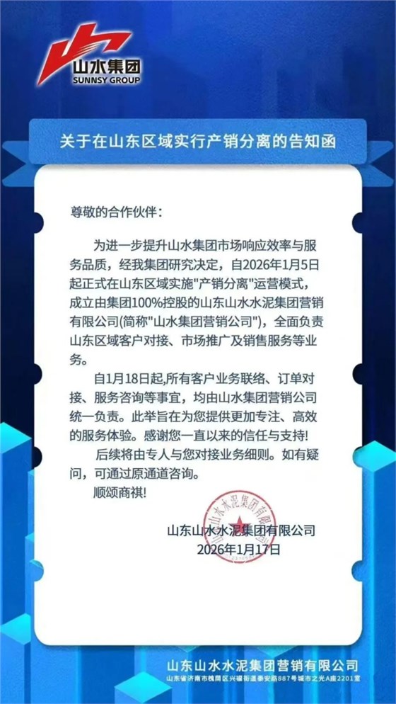 1月17日,山水集团发布《关于在山东区域实行产销分离的告知函》称,自2026年1月5日起正式在山东区域实施"产销分离"运营模式,成立由山水集团100%控股的山东山水水泥集团营销有限公司,全面负责山东区域客户对接、市场推广及销售服务等业务。