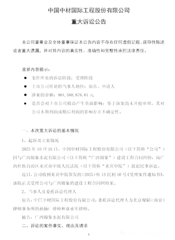 11月1日,中国中材国际工程股份有限公司发布公告,因与广西锦象水泥有限公司存在建设工程合同纠纷,公司已向广西壮族自治区来宾市中级人民法院提起民事诉讼,涉案金额达90458.09万元(约9.05亿元)。目前,法院已正式受理该案,案件处于受理阶段。