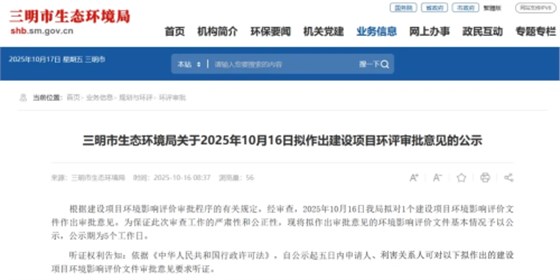 10月16日,福建省三明市生态环境局发布“关于2025年10月16日拟作出建设项目环评审批意见的公示”。根据建设项目环境影响评价审批程序的有关规定,经审查,2025年10月16日我局拟对1个建设项目环境影响评价文件作出审批意见。