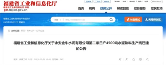 据福建工信厅今年2月发布公告称,2015年9月,《工业和信息化部发展改革委关于认定江苏等七省区水泥、平板玻璃在建项目的通知》(工信部联原函〔2015〕458号)认定“永安金牛水泥有限公司2×4500t/d新型干法水泥熟料生产线配套10MW纯低温余热发电技改项目”为符合布局规划和产能等量或减量置换原则的在建水泥项目。