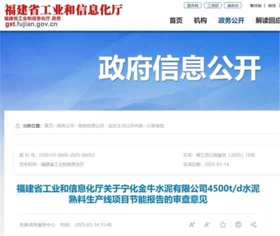 福建工信厅3月发布“关于宁化金牛水泥有限公司4500t/d水泥熟料生产线项目节能报告的审查意见”称,原则同意所报项目节能报告通过审查。