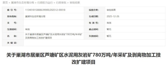 近日,安徽省巢湖市生态环境分局发布关于巢湖市居巢区芦塘矿区水泥用灰岩矿780万吨/年采矿及剥离物加工技改扩建项目。